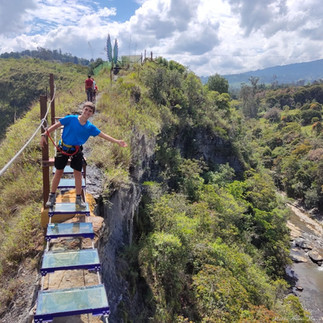 ביום שלישי דביר עוד לא היה כשיר ללכת בצורה סבירה והחלטנו להשאיר את המתבגר לבדו בבית…שמנו פעמינו לעבר Paso Del Angel – מעבר צר בין 2 נחלים, עד לפני 9 חודשים המקום היה פתוח לכל עובר אורח והיה אפשר לטייל שם בכיף – רוכבי אופנים אוהבי אקסטרים היו רוכבים על המעבר הצר הזה.. היום המקום נהיה פארק אקסטרים וטבע לכל אוהבי הטבע …נסענו לשם בלי לדעת ב-100 אחוז מה באמת קורה שם היום.. בתחנה המרכזית מצאנו את ג'ימי הנהג שנהיה חיש מהר לחבר לכולנו באותו יום ובמחיר של 160 פסו (פחות מ-150 שח) ילווה אותנו כל היום, יטייל איתנו במסלול, יאכל איתנו וילמד אותנו ספרדית. וכך הגענו לפארק האקסטרים הקטן והחביב בנוף משגע, בעמדת התשלום הסתבר שהם אינם מקבלים כרטיס אשראי הלב ירד לתחתונים עוד לפני שעליתי על האומגה…אבל קולומביאנים כמו קולומביאנים – כולם חשו לעזור. זה ששמע שאנחנו מישראל והתלהב מהעינים של המשפחה רצה לשלם את ההפרש שלא היה לנו במזומן, הנהג שניסה לסייע ובסוף – בעלת העסק הרגיעה את כולם והודיעה: "יש לכם הנחה אין צורך בכל התשלום". מה אגיד לכם? אתגעגע אל החבר'ה האלה.התחלנו את ההליכה (מאובטחים היטב ועם מדריכה צמודה) בין הנחל על גשרים, במעבר הצר הליכה על גשר צר ולקינוח אומגה מטריפה. ג'ימי צפה ועודד את כולנו מרחוק ולנו היה באמת כיף חיים!משם המשכנו ל-Cascada De Hayal גם שם עמד גובה הכספים במזומן.. הפעם ג'ימי הלווה לנו את הכסף עד שנגיע לכספומט הקרוב. שמנו פעמינו לעבר המפל, התחלנו בתצפית יפיפיה אל המפל שגובהו כ-60 מטר,והמשכנו בירידה נוחה למפל שנמצא מעל מערה ענקית – המחזה מרשים ביותר, שוב תחושת המים שעפים עליך מעוצמת הזרימה ומרטיבים אותך היתה מהנה במיוחד ,טיפסנו חזרה וסיכמנו עוד יום מוצלח. רק חבל שדבירי לא היה איתנו.